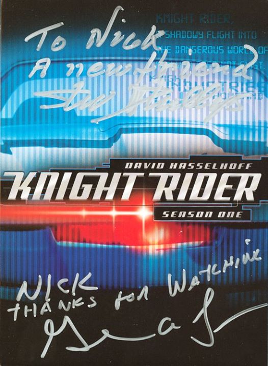I told Glen how much I admired Knight Rider and how much the show meant to me and how it changed my life as a kid growing up. At this time Knight Rider had just come out with Season 1 on dvd but I had collected all the VHS tapes released by Columbia House. Imagine my surprise when Glen asked James to retrieve a box set from his collection. Not only did Glen give me a brand new shiny Season 1 box set that night but he also personally signed it me. (Which is now signed by many more cast/crew)